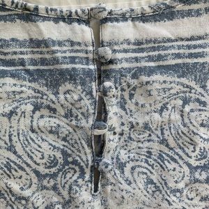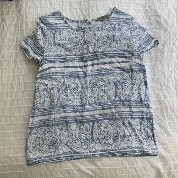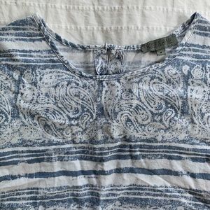 Rose & Rhyme (TJ Maxx brand) linen blend T-shirt top with button back. Faded indigo blue pattern with stripes and paisley. Missing one button in back, see photo. Boxy fit. In excellent condition.