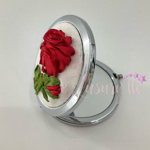 Rose Ribbon Embroidery Compact Mirror, Birthday Gift, Off-white