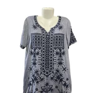The dress features a flattering V-neckline & a loose, easy-wearing silhouette that falls to a slightly above-the-knee, making it ideal for warmer weather or layering. Its most striking element is the deep blue, tribal-inspired embroidery. This intricate, symmetrical geometric pattern runs vertically down the center front and is echoed in smaller, complementary motifs around the neckline and sleeves. The aesthetic of the embroidery adds a unique, ethnic touch.