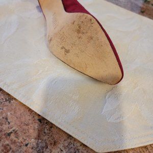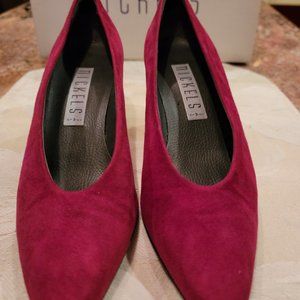 These are in brand new condition. There are no marks or flaws anywhere. You can see from the sole of the shoe in the last photo, the soles have minor scuffing from a couple wears. They are a beautiful color of rose and in suede.
