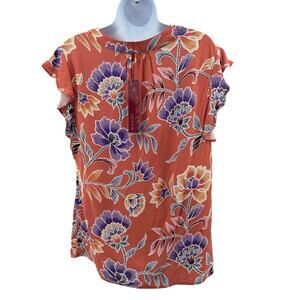 Rose & Thyme Floral Blouse WMNS M Orange Multi Flutter Sleeve V-Neck Lightweight