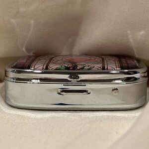 Gorgeous travel size rose with stained glass looks Beauty and the Beast inspired! Pill case with 2 compartments, use for medicine, vitamins. Pocket or purse use, keep it in the car. Also has a mirror on inner lid. Made with shockproof durable metal outer shell that protects and keeps meds and supplements safe from damaging moisture and oxidation. Great little gifts for hostesses, teachers, stockings, etc. I ship fast usually within a business day!
