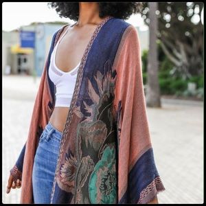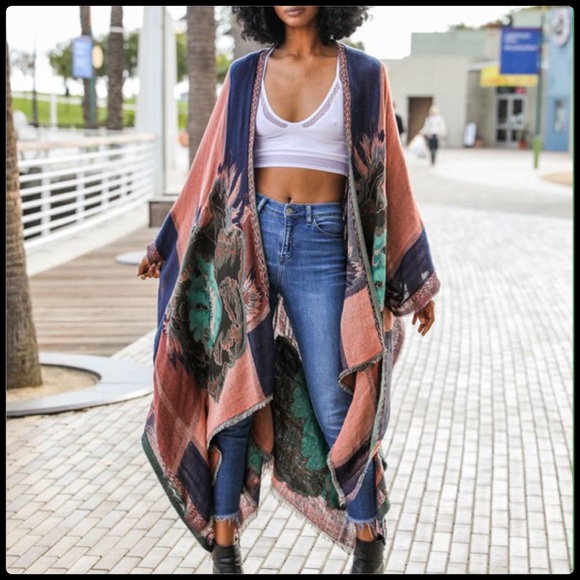 Rose Woven Colorblock Transitional Ruana. Floral print. Perfect for transitioning from one season to another. Woven 60% Acrylic 40% Viscose. Dimensions: 73" x 55" . Colors: blue, greens, black, melon orange.