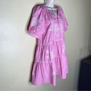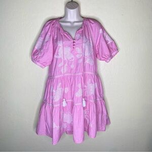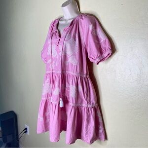 Stylish pink tunic dress featuring white floral embroidery with delicate puffed sleeves and tassel accents. Has pockets! perfect for a feminine, relaxed look.