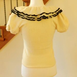 This is one of the prettiest sweaters ever! An ivory cream ruffle cardigan by Leifsdottir for Anthropologie. Trimmed with black rosette appliques. Covered buttons. Wool/angora blend. Puffed short sleeves. Size small.