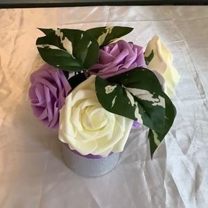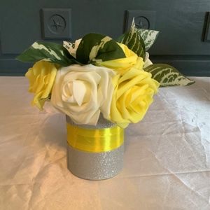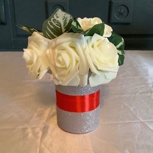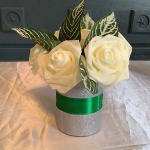 This is a listing for a custom made and handmade rose centerpiece embellished with satin and silver glitter ribbon with greenery. You pick the colors of the satin ribbon and the colors of the roses. The floral arrangement will be made when you order it according to your specifications & wishes.