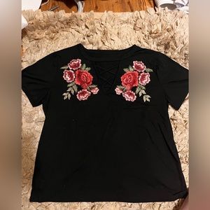 Rose embroidered large top has criss cross neckline