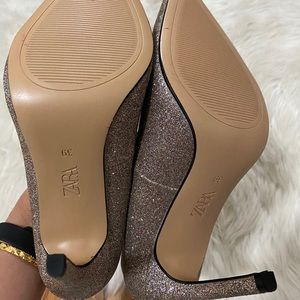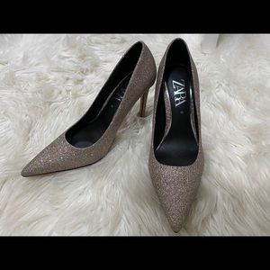 Brand new, never worn, Zara pumps! They’re a rose gold/nude glitter covered shoe perfect for NYE!