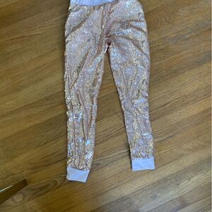 Rose gold, micro sequin, joggers, contrasting cuff, size small. Side pockets