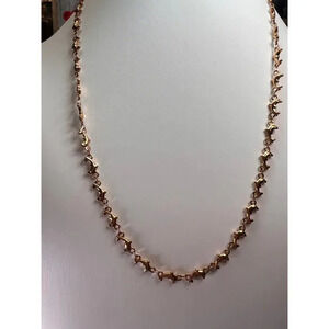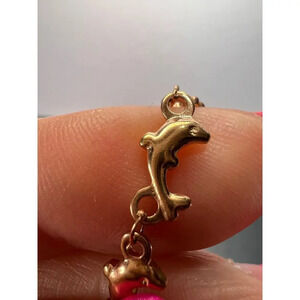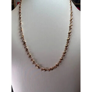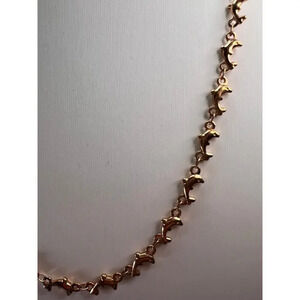 Uniquely designed dolphins necklace with a stainless steel base metal and rose gold plating. Measures 20 inches in length. Lobster claw clasp