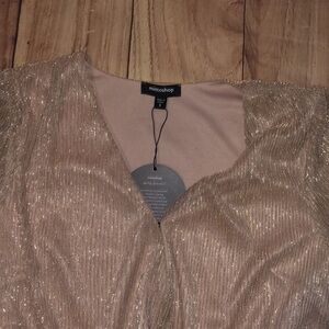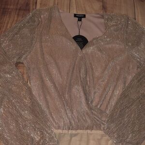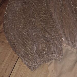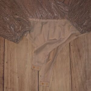 Rose gold or light pink color. Ribbed sparkly bodysuit. Size small. Brand new with tags. Bought from a boutique I just never wear. There is a little snap button in the middle of the v neck or chest area. Smoke free home