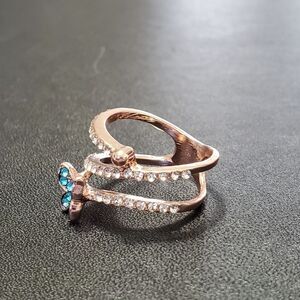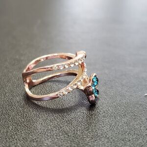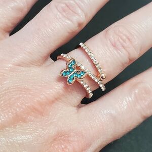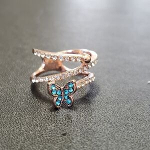 Gorgeous ring is rose gold colored with clear rhinestones and features a butterfly accented with blue rhinestones.
