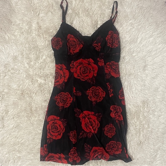 Feminine slip dress with adjustable spaghetti straps. Bold red rose print on a black base. Soft, flowy silhouette that's perfect for layering or wearing solo.