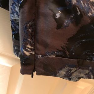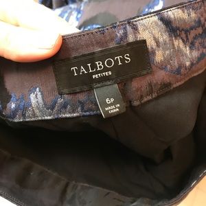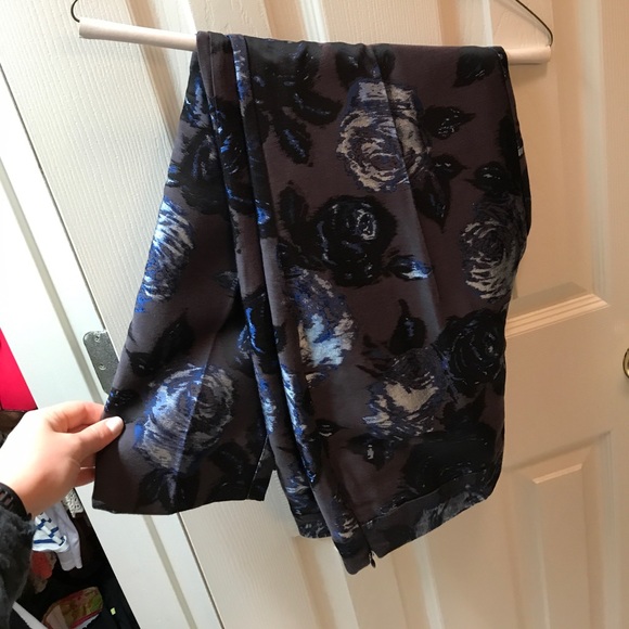 Size 6p Talbots slacks. Charcoal with blue, silver, and black roses. Side zipper. Worn once. Perfect condition. Match anthro black and blue lace top in my closet!!