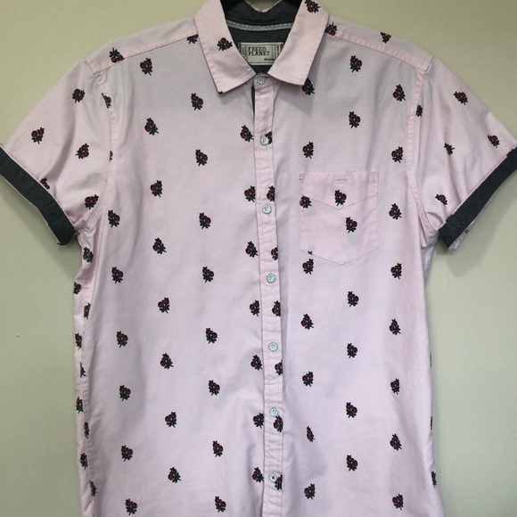 Men’s pink and grey rose patterned button down.