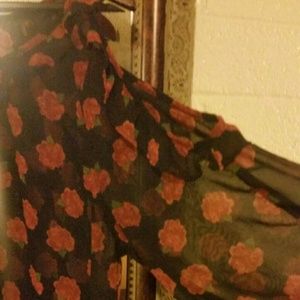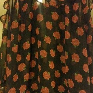 Adorable! Tiny ruffle neckline bordering exposed shoulder detail. Sheer billowy blouse, slightly longer in back than front, coral rose pattern. Great condition