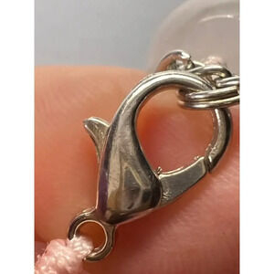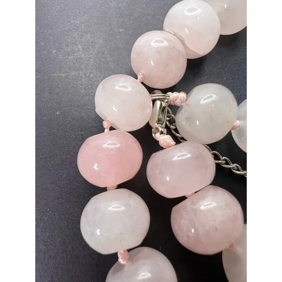 Rose quartz rondelle beads knotted in between. Beads measure about 14mm. Necklace is about 18 inches in length. Clasp initially looks like sterling but no stamps found. I believe it’s stainless steel. Has 1.5 inch chain extension.