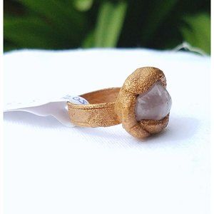 A cute little ring that has been handcrafted from a ring base and a raw rose quartz colored stone using the electro forming copper plating method.