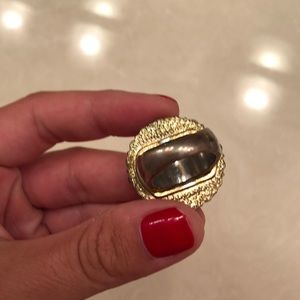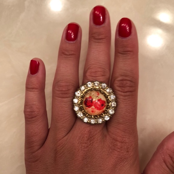 Ring with roses in middle and jewel halo. Roughly a size 8 ring. Tarnished but looks vintage and chic!