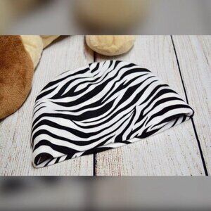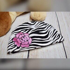 Baby girls zebra print beenie with pink rose. One Size, it fit my daughter until she was about 9 months old.