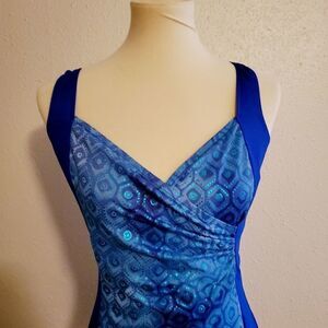 Blue one piece, low spoon open back. Beautiful abstract wrap front design. Modest in comparison to modern standards. Pre-owned in great vintage condition. Vintage Size 14 ( sometimes they can run a little smaller). Please refer to pictures and measurements for best fit, and condition verification. Beat described by pictures itself. Sale is final.