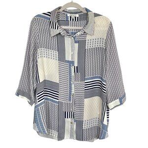 Rose+Olive Patchwork Button Down Shirt Collar 3/4 Sleeve Blouse Blue White 1X