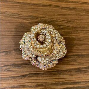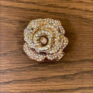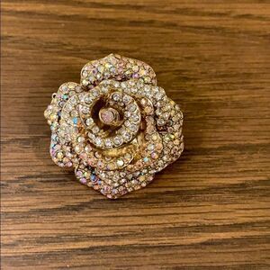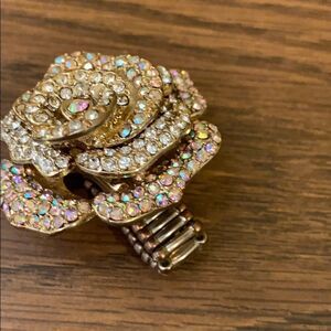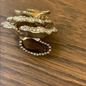 Pretty rhinestone rise ring is gold with iridescent stones. No missing stones. Stretchy band. Fits ring finger comfortably with 6 1/2 size finger. Stretches. 2” width. Chunky Ring.