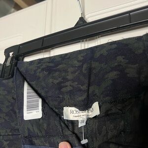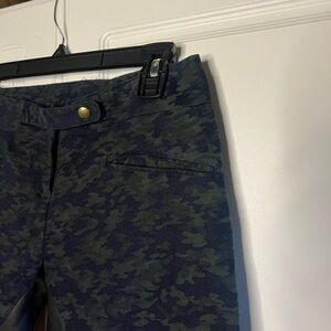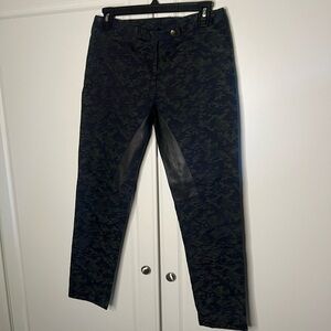 Roseanna made in France subtle camo print trousers with chap inner thigh leather accents. Zip with cross button at top and pockets. Fabric is a cotton jacquard. Size French 36, US 4.