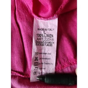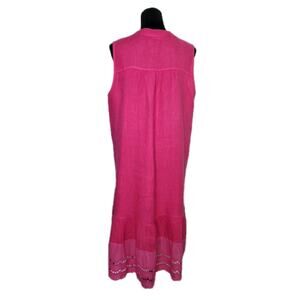 The Rosemarine Pink Linen Sleeveless Midi Dress is a stylish and elegant choice for summer or spring travels. Made in Italy, this dress features a V-neckline and an eyelet lace bottom with pintuck accents, adding a touch of sophistication. The lightweight linen material and collarless design make it perfect for a day at the beach or a resortwear outing. Hand wash only to maintain its quality, this dress in size L is a versatile option for casual yet chic occasions.