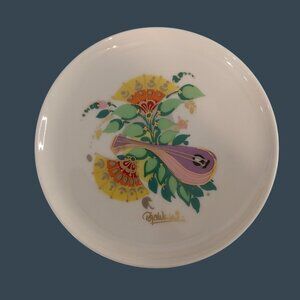 A small collectible plate featuring a vibrant floral and mandolin designed by Bjorn Wiinblad and, crafted by Rosenthal Germany. Ideal for display or collection.