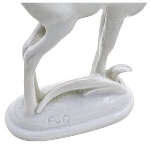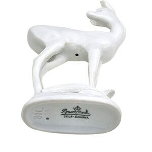 1930's design of a small white Rosenthal porcelain standing deer on a knoll The figurine is marked on the bottom with "Rosenthal Selb-Barvaria," stamped 806 over 16, and on the edge of the knoll are the initias F v G (for the German sculptor Fritz von Graevenitz, 1892 – 1959.) This beautiful, delicate figurine is in excellent vintage condition, with no chips, cracks, or discoloration. Please review all photos before purchasing. The figurine in the photos is the actual figurine being sold.