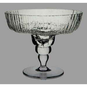 Designed by Tapio Wirkkala in 1969. This lovely compote from the land of ice and snow resembles melting ice. It is mould blown glass with a flat ground rim, and measures 6" tall by 5 and 3/4" in diameter at the widest point.