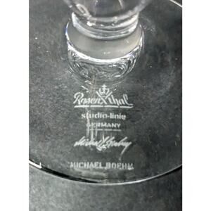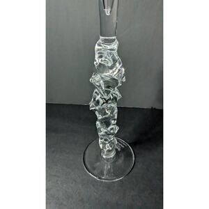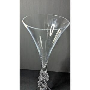 Single Rosenthal Germany Crystal Hand Blown Art Glass very large 13.75" tall Toasting Champagne Flute designed by Michael Boehm. The champagne glass is acid stamped "Rosenthal Studio-Line Germany Michael Boehm" on the bottom of the base The stem is made up of stacked pointed free form pieces of glass and the bowl are a thin delicate trumpet shape. It is in excellent condition with no chips, cracks, or fleabites. Very clean and clearl. It meass measures about 13 3/4" tall, 3 3/8" to 3 7/16" across tops, and 3 1/8" to 3 1/4" at the base.