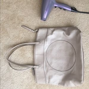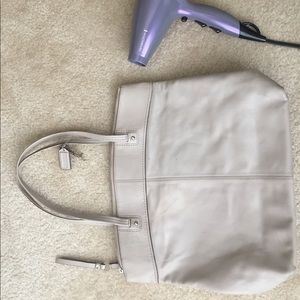 Beautiful light pink/nude colored all leather coach purse. Not a lot of wear or tear. There is a spot that was rubbed on the side(see picture ) size comparison I used the hair dryer next to it.