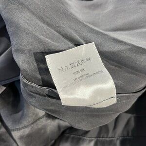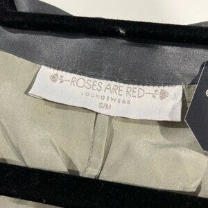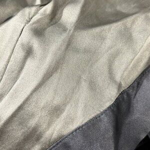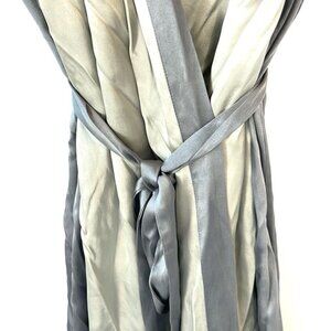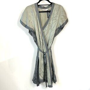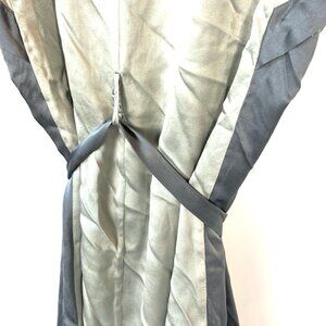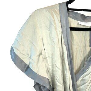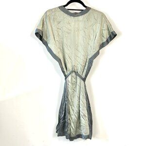 Circa 2015, the Morning Quote kimono from Roses Are Red is made with a romantic silk satin in a muted Mint, and is piped with a contrast grey on the edges. It features batwing sleeves, a V-neck, a self waist-tie woven through loops, and side slits.