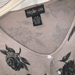 Gray and black button-down cardigan with roses on it. Gives off that vintage pinup or even grunge feel. Size medium. 45% Cotton 55% acrylic great used condition!