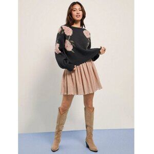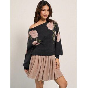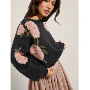 Roses Print Grey Knit Round Neck Long Sleeve Pullover Sweater