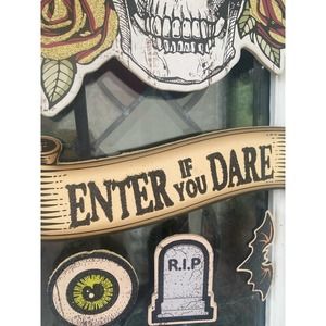 This "Enter if you dare" skull sign will get you, your house and your guests into the Halloween spirit! This Skeleton wall plaque features roses, a RIP tombstone, creepy bat and an eyeball that dangle from the bottom for some extra fun.