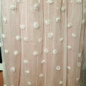 Handmade, Breathtaking moon and star fabric backdrop with 50 glittered realistic foam roses with 50 Swarovski Crystals that were hand applied. The fabrics sheen makes for beautiful photographs. Measuring 53'' x 63'' the fabric is Fashioned with White Sheer Tulle & a pink layer adorned with crystals and roses. The double layer adds the ability to have 2 different sets of photo options and also the ability to use this as a window treatment or year round wall decoration in any room.especially great for kids decor!