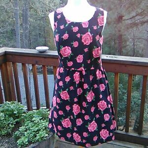 Pretty dark floral in a fit and flare shape. Full skirt with net added to lining for shape. Back zip, v back, round neck in front. Woven fabric, keeps a nice silhouette. Size 2X measures 46 at chest, 40 at waist, full skirt, 38 long from shoulder to hem. So pretty all year.