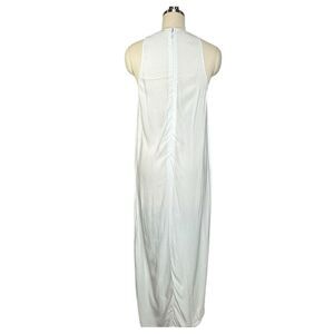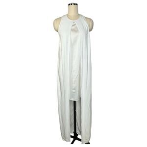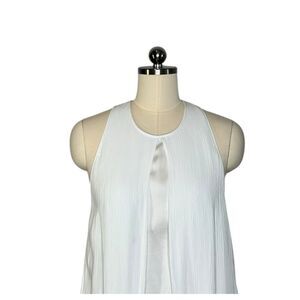 Long white crepe flowy sleeveless dress with white satin shift beneath. Back zipper. Please note one tiny discoloration near the neckline which is so faint I nearly overlooked it.