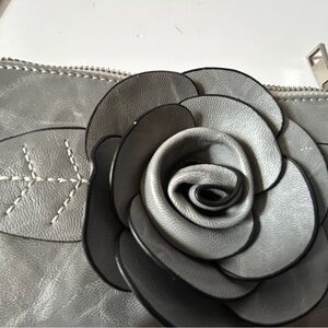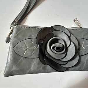 Never used ! This elegant gray clutch features a beautiful floral design, perfect for any occasion. Its sleek design and neutral color make it a versatile accessory.
