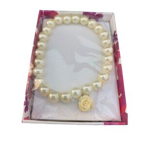 Rosette Touches Stretch Bracelet White Faux Pearls w/ Flower Charm (1637-1-2)