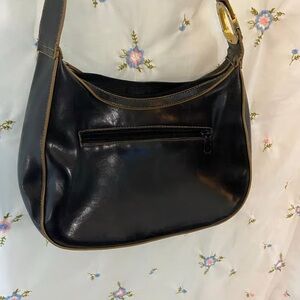 Chic leather hobo bag by Rosetti. Elegant black with tan trim. Features gold hardware.