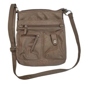 This Rosetti brown leather shoulder bag offers ample space with multiple compartments and a secure zip closure, ideal for daily use.