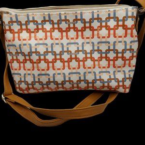 Rosetti crossbody purse in very good used condition. No rips, tears, or stains. The outside has a chain link design with a small front zippered pocket, then a larger pocket that has a snap closure (right behind the Rosetti emblem). The main section of the purse has a zippered closure. The inside is lined in fabric, one zippered pocket and one open pocket.