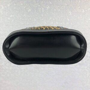 Purse fabric print is leopard print with black accents and vinyl trim
