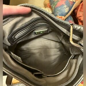 Pewter metallic pebbled vegan leather. Zip closure. Outside open and zip pockets. Inside zip and open pockets.