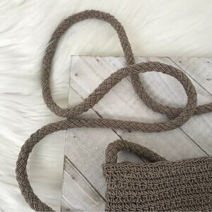 Good pre worn vintage condition. I love this adorable woven knit bag. So cute with the striped colors and floral metal bag charm. This has a long strap and fits like a crossbody bag. Very clean. Does have a print around the inner zipper. All sales final.
