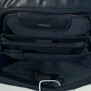 Rosetti black shoulder bag. 2 front pockets - 1 snap-closed and the other with side zippers; 1 large zippered pocket with small zippered pocket inside; back pocket has labeled places for cosmetics, coupons/receipts; a zippered pocket for credit card/cash, check book, along with another open pocket and a place for your pen. Approximate size: 10.5"w x 3.5"d x 9"h (at highest point). From curve of bag to top of handle measures approximately 13" In excellent condition.